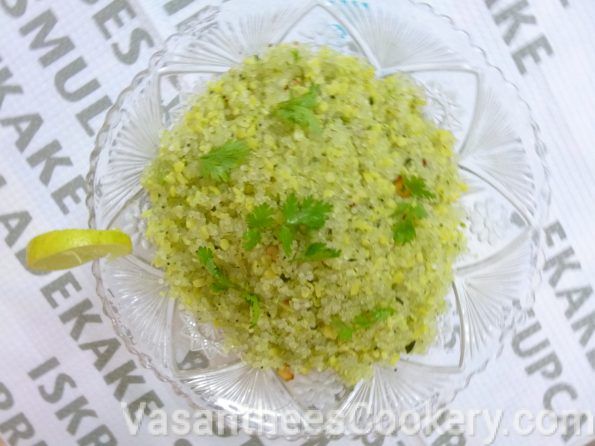 Sago Upma Ingredients: Sago 1 cup Peeled broken green gram 1/4 cup (Pasiparuppu) Grated coconut 4 tbsp Long green chillies 3 Lemon 1 (medium size) Curry leaves and corianderleaves A few Salt Broken cashews 6 Preparation Method: Wash well the sago quickly and drain the water well. Add one cup of water. Add required salt and mix well and close it with a lid. Keep it aside for 4 hours. Pressure cook green gram dhal with little water. Dhal should be separate and soft. Dry grind chillies,curry leaves and coriander leaves. Add 4 tbsp oil to a hot tawa and add 1 tsp mustard seeds. Add 2 tsp of urad dhal and 1 tbsp of bengal gram and cashews. Fry till golden and add soaked sago and fry in a high heat. Fry till sago becomes soft. Sago will be soft with in 3 to 4 minutes. Sprinkle little water if sago is hard. Add ground paste and mix well. Now add green gram dhal, grated coconut and mix it in medium heat. Add little salt for green gram dhal alone and mix well. Add lemon juice and mix well and remove from heat. Lemon juice can be added as per taste. Serve hot with vadu mangai.