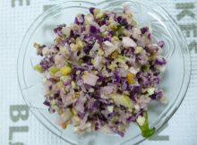 INGREDIENTS: Cut violet cabbage 1 cup Peeled broken green gram 2 tbsp Grated coconut 1 tbsp Green chilly 1 (Long) Curry leaves and coriander leaves A few Salt